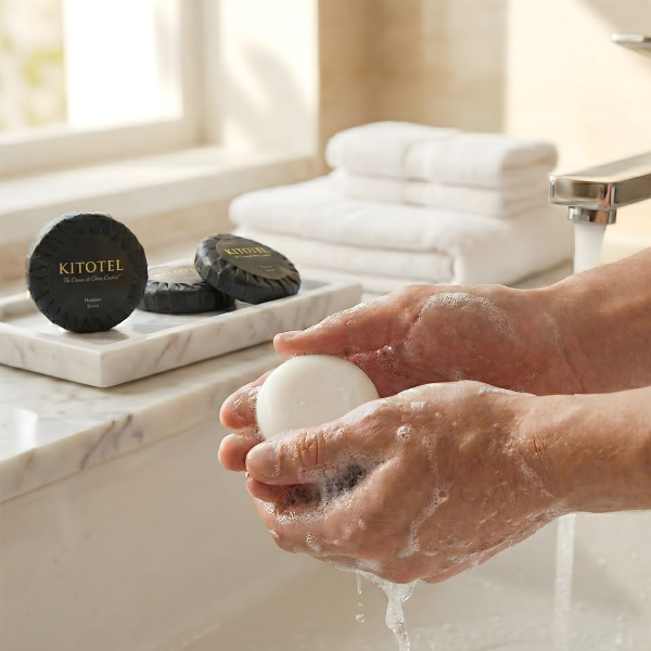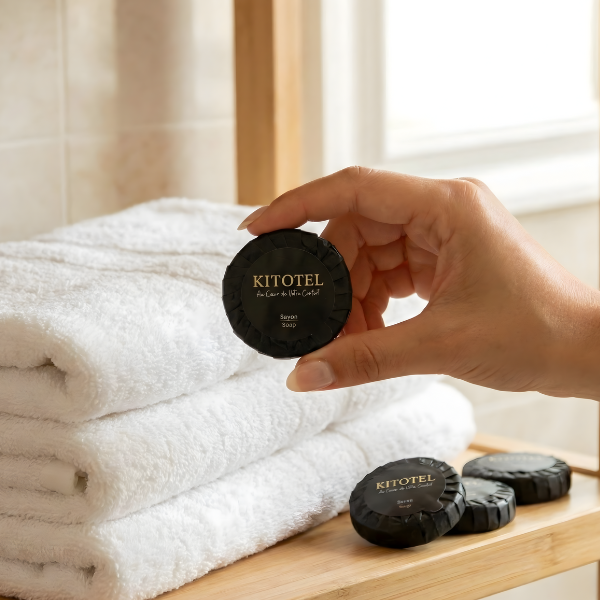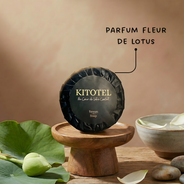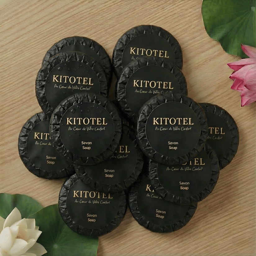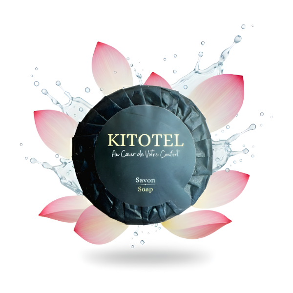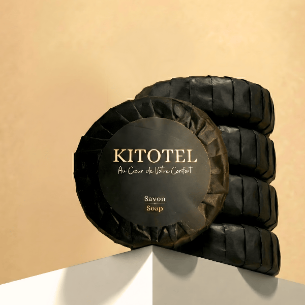 La savonnette Kitotel se distingue par son présentation soignée en papier plissé noir. Ce type d'emballage, traditionnellement réservé aux hotels, protège le savon tout en apportant une touche décorative indéniable sur le rebord du lavabo.