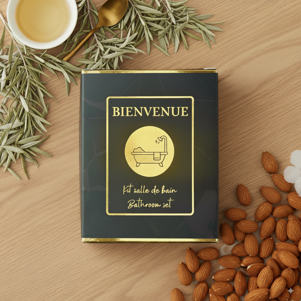 Un kit d’accueil salle de bain présenté dans un écrin en carton noir au fini mat et doré, comprenant :
